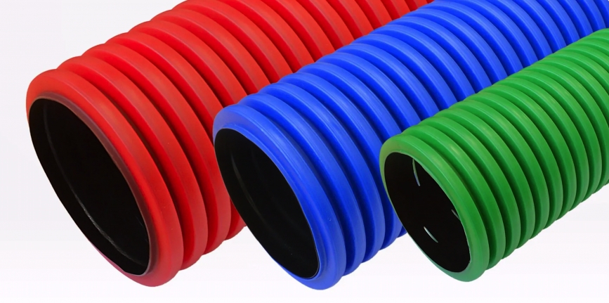 • Внешний слой: Выполнен из ПНД (полиэтилена низкого давления) с глубоким гофром, что гарантирует высокий класс кольцевой жесткости (SN8, SN12 и выше).